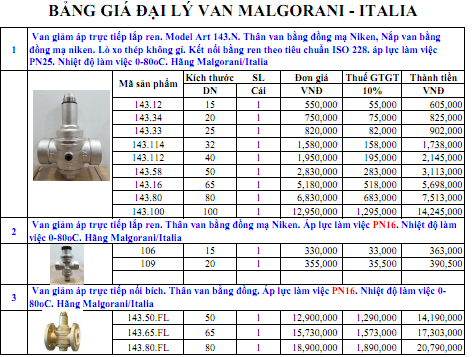 Mô tả : max_inlet_P= 25 Bar, outlet_P= 0.5-6 Bar, outlet_P(chỉnh sẵn)= 3 Bar, Tmax= 130 độ C, thân đồng, nối ren, CO_CQ: Italy